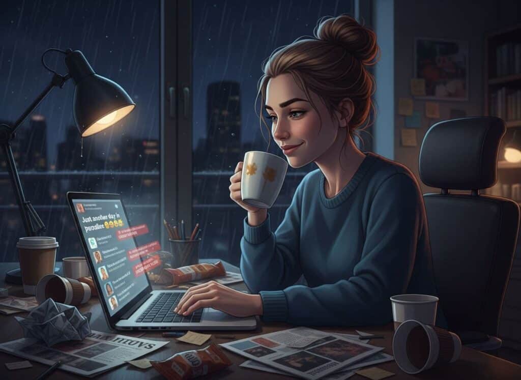 A young woman in a dimly lit home office smugly posts an insensitive social media update about a global tragedy, unaware of the angry backlash flooding her screen.